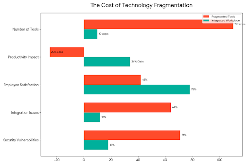 Technology Fragmentation: The average enterprise uses 110 different SaaS applications, leading to data silos and 20-30% efficiency losses. The solution involves consolidating platforms and choosing systems that integrate well.