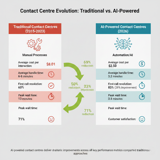 Contact centres have undergone remarkable transformation over the past decade. In 2015, the average cost per contact centre interaction was $8.01, primarily through voice channels. Traditional call centres operated with average handle times of 6-8 minutes and first-call resolution rates hovering around 60%. Agents spent considerable time navigating multiple systems, searching for customer information, and escalating complex issues. This approach often resulted in long wait times—averaging 13 minutes during peak periods—inconsistent service quality, and frustrated customers.